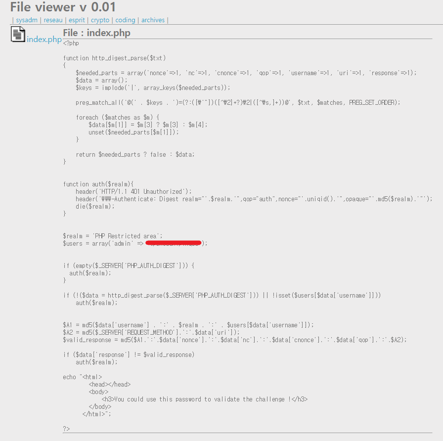 admin디렉터리 안에는 index.php라는 php파일이 있는데 이를 열어 소스코드를 보면